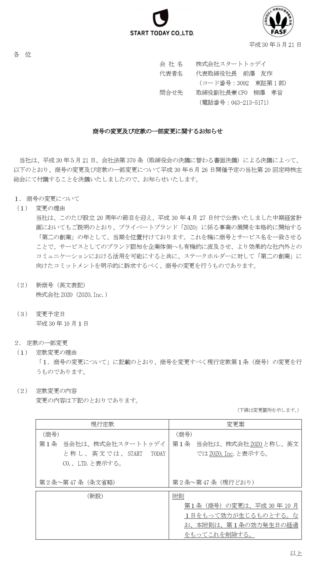 商号の変更及び定款の一部変更に関するお知らせ