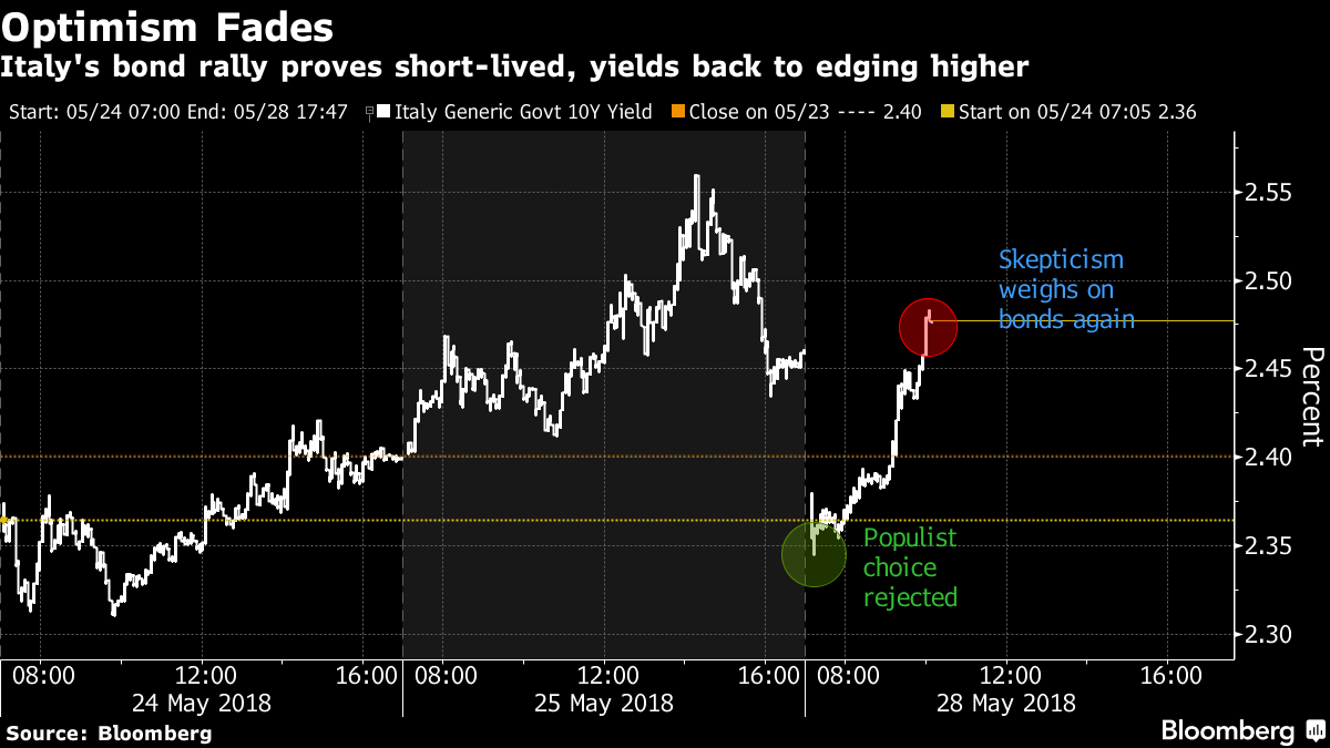 28日のイタリア金融市場では株と国債が一時の上げを失い、下落に転じた。ポピュリスト政党は連立政権樹立に失敗し、マッタレッラ大統領はエコノミストのカルロ・コッタレッリ氏に組閣を要請した。