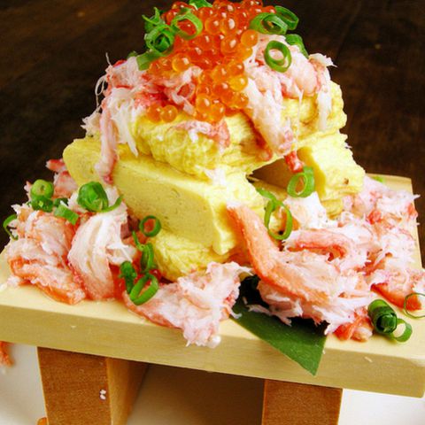 豪快贅沢出汁巻き♪ぷるぷるの出汁巻き玉子にどっさり鳥取県境港の紅ズワイガニをたっぷりぶっかけ★さらに三陸産イクラもぶっかけた、当店の名物料理!