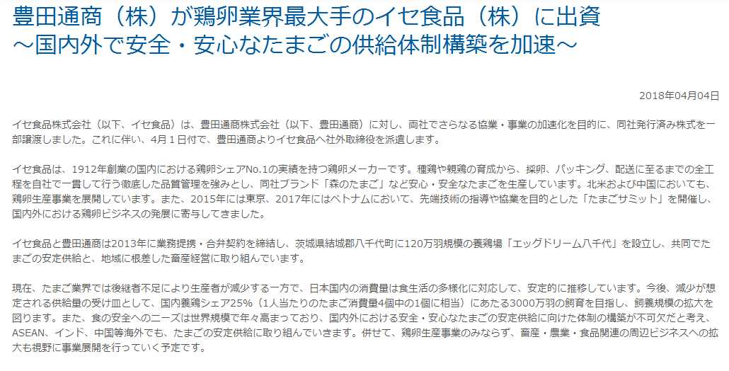 豊田通商が鶏卵業界最大手のイセ食品に出資(2018/04/04)