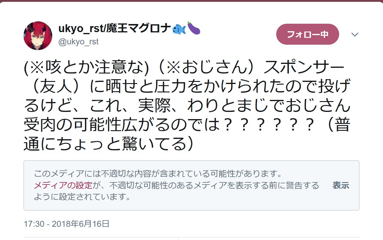 マグロナ先生がUPした7秒の咳込みボイスのツイートなんか、「不適切な内容が含まれている可能性があります」とTwitterにフィルタリングされていましたからね。