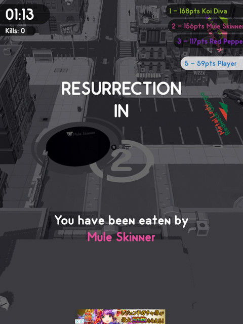 ブラックホール同士がぶつかったとき、小さいブラックホールは吸収されて相手のスコアが増えてしまう。つまり、でかい相手がいるだけでその場所に近づけず、でかいブラックホールが移動した後に残るのは更地だけ。圧倒的に成長が遅くなる。
