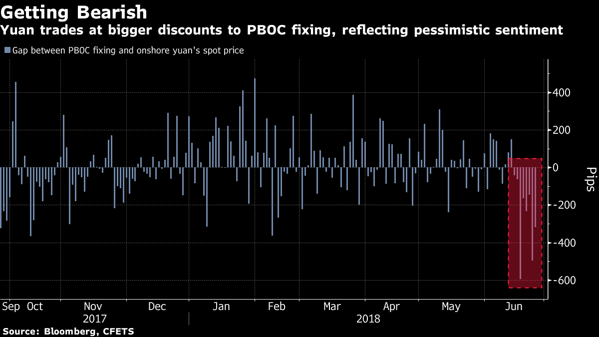 24通貨に対する人民元の動きを示す「CFETS(中国外国為替取引システム)人民元指数」を基にしたブルームバーグのレプリカはここ1週間で1.6%下落。人民元はこの間、ドルに対し1%値下がりし、26日の取引では6.5574元と昨年12月以来の安値を付けた。
