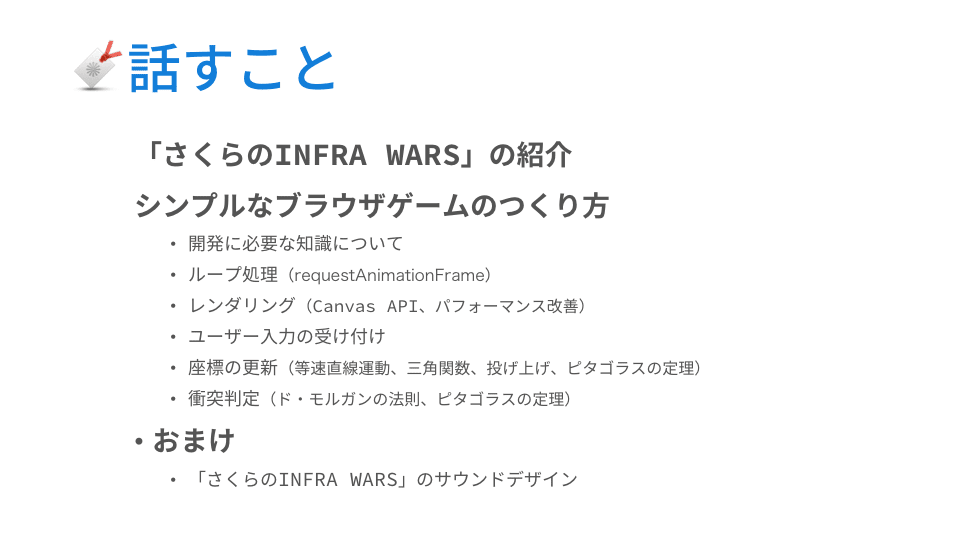 最初に、ざっくりエイプリルフールでリリースした「さくらのINFRA WARS」というブラウザゲームについて紹介してから、シンプルなブラウザゲームのつくり方を発表します。
