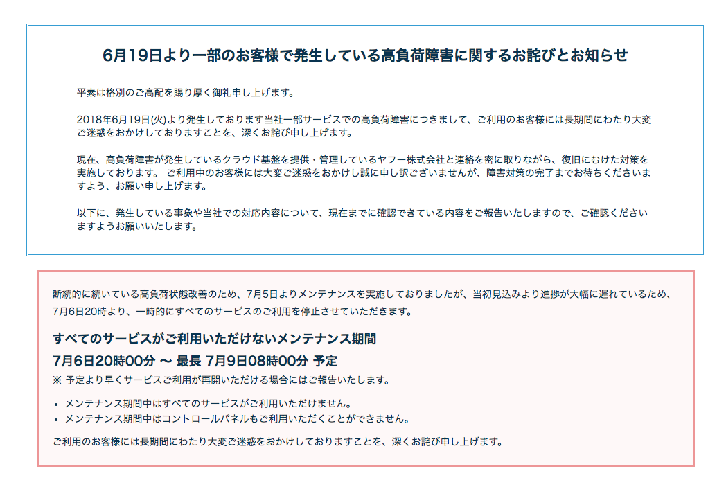 断続的に続いている高負荷状態改善のため、7月5日よりメンテナンスを実施しておりましたが、当初見込みより進捗が大幅に遅れているため、