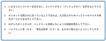 衛生対策では「床上の場合」と「家の周囲や床下の場合」それぞれのやり方を解説しており、また食中毒や感染症の予防についても「受水槽は、安全と衛生を点検・確認してから使用してください」「からだに異常を感じたら早めに医療機関で受診してください」といった慎重な安全対策を呼びかけています。