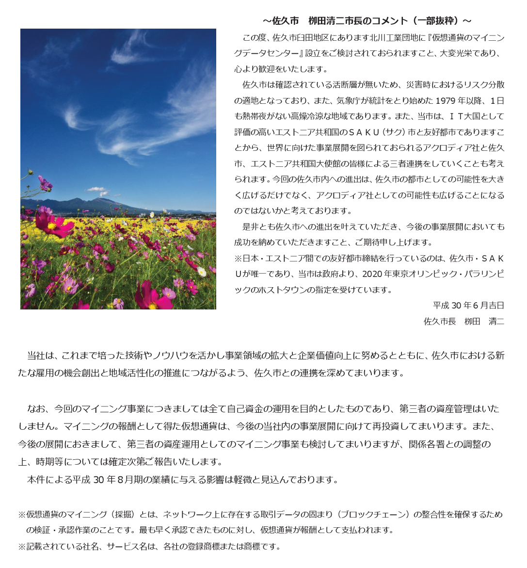 2018年07月17日 長野県佐久市の柳田清二市長、アクロディアの仮想通貨マイニングデータセンター設営を心より歓迎 カテゴリ:FX・為替・仮想通貨 2018/07/17 アクロディア、長野県佐久市に仮想通貨のマイニングファームを設営 https://acrodea.co.jp/ir/news/ ※市場関係者の一般常識に反して、長野県佐久市の柳田清二市長「大変光栄であり、心より歓迎」 スポンサーリンク コメント コメント一覧 1. 全力で名無しさん 2018年07月17日 20:42 ID:jRcJAMV10 最後の写真、今の中国と昔の中国が混在していて味わい深い 2. 全力で名無しさん 2018年07月17日 21:00 ID:k6J3.C5v0 地元だけど、マジでやめてくれよ・・・ 佐久の鯉、美味しいよ 3. 全力で名無しさん 2018年07月17日 21:05 ID:EZsMC1Og0 電気を使って「熱」を作り出す会社です。 4. 全力で名無しさん 2018年07月17日 21:12 ID:c8ZVqVLZ0 小諸が笑う番か 5. 全力で名無しさん 2018年07月17日 21:16 ID:sQqxmh480 助成金詐欺でもやらかすんやろ 6. 全力で名無しさん 2018年07月17日 21:22 ID:jQFVIKy10 ちょっと前はソシャゲで今度は仮想通貨ね アクロディアはどれも乗るのが1テンポ遅いw 7. 全力で名無しさん 2018年07月17日 21:28 ID:.wxRfmxp0 一応突っ込んでおくが、電気料金は三段階料金なので、使いまくると単価が激増しまっせ。 そういうのがない国で、マイニングしまくっているんだろうけど 8. 全力で名無しさん 2018年07月17日 21:42 ID:qyKcarSW0 20年後のソーラー発電がきっと地獄。 9. 全力で名無しさん 2018年07月17日 21:44 ID:hpEmTPWj0 最後何?食うの? 10. 全力で名無しさん 2018年07月17日 22:02 ID:i69tojYF0 そりゃ、自治体は税金落としてくれるなら、儲かろうが層で無かろうが知ったこっちゃないだろ 11. 全力で名無しさん 2018年07月17日 22:03 ID:KbDIVkwh0 6000ドルくらいじゃなかったっけ、損益分岐点。 12. 全力で名無しさん 2018年07月17日 22:28 ID:O8brEfHA0 松本 伊那 佐久 善光寺 大丈夫まだ3つある 佐久が死んでも信州は死なん 13. 全力で名無しさん 2018年07月17日 22:43 ID:TqjsOT5M0 長野なんて松本だけやろ 14. 全力で名無しさん 2018年07月17日 23:54 ID:.luxP9vA0 最後の写真何してんの? 結局儲かるのは採掘用の半導体作ってるメーカーってことなんかね。 コメントフォーム 名前 コメント 評価する リセット リセット 顔 星 投稿する 情報を記憶
