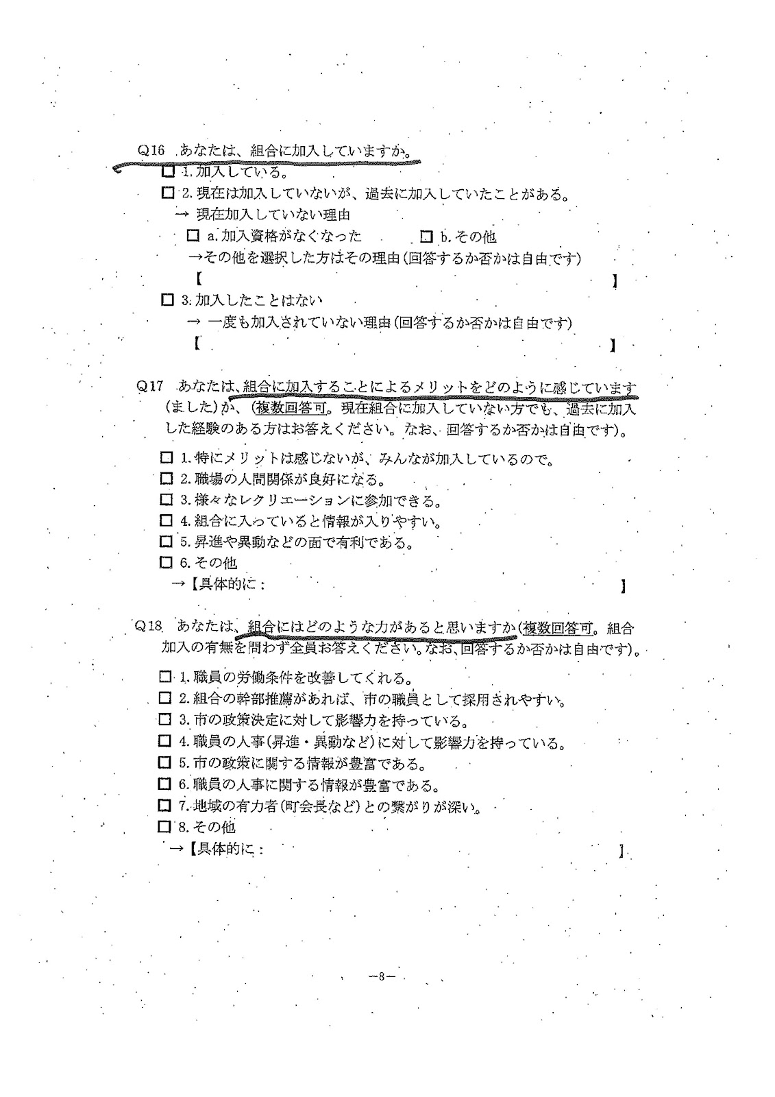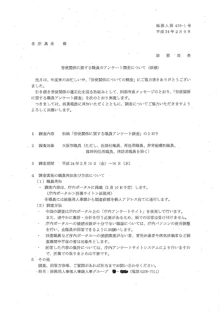 ・・・今 大阪市職員に対して、組合活動への参加や、選挙への応援の参加について、アンケートを始めました。しかも、それは職務命令ということで、正確に書かないと処分もありという内容です。密告システムづくりでもあります、恐怖政治です。添付の原文をお読みください。報道もされていますが、やはり原文を見てほしいですね。以下に原文を掲載するが、背筋が寒くなる内容だ。「正確な解答をしない場合は処分の対象になる」とし、自らの違法行為を報告した場合懲戒処分を軽減するが、「特に悪質な場合を除いて免職としない」ということは、「悪質」の場合は免職すると宣言しているのである。職員の組合活動を一部始終報告させ、街頭宣伝を聞いたことまで政治活動として報告させようとしている。組合や政治活動に関与している人を匿名で密告させるシステムまで完備している。このような思想調査を公務員に対して行っている。これはいつの時代のどこの国の話か、と思う。このような暴挙を許してはいけない。(関連報道下方参照)@PeacePhilosophy