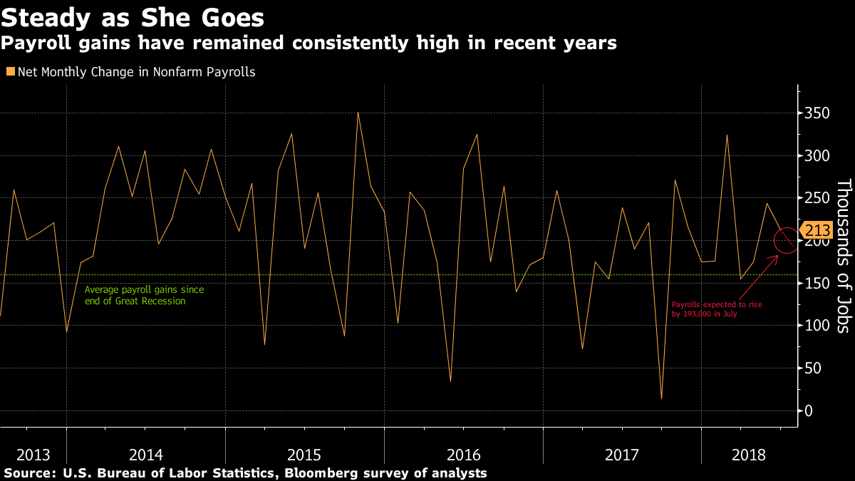 月の最初の金曜日ということは米雇用統計の発表日。ブルームバーグの最新調査では7月は非農業部門雇用者数が前月比19万3000人増え、失業率は3.9%に低下する見込み。通商対立が続く中で関心が集まる米貿易赤字は6月、461億ドルに拡大したと予想されている。