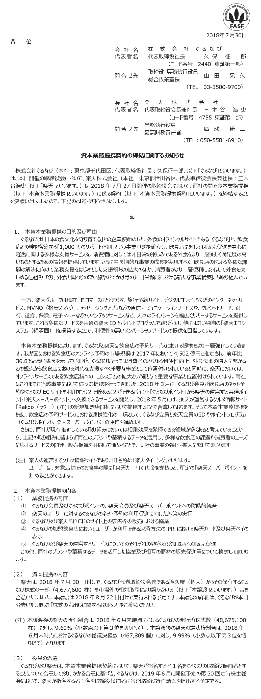 2018/07/30 15:10 ぐるなび 資本業務提携契約の締結に関するお知らせ
