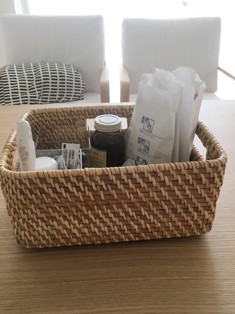 夫が毎日飲む薬は、ラタンバスケットに入れています。