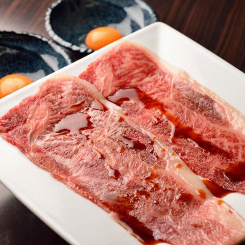 肩ロース最高部位のザブトンを焼きすきで!甘めの特製タレがかかった大判カットのザブトンを炭火で炙り、溶き玉子につけてお召し上がりください。スタッフが美味しくお焼きします♪