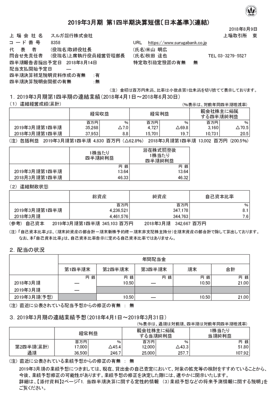 2018/08/09 15:00 スルガ銀行 2019年3月期 第1四半期決算短信〔日本基準〕(連結)