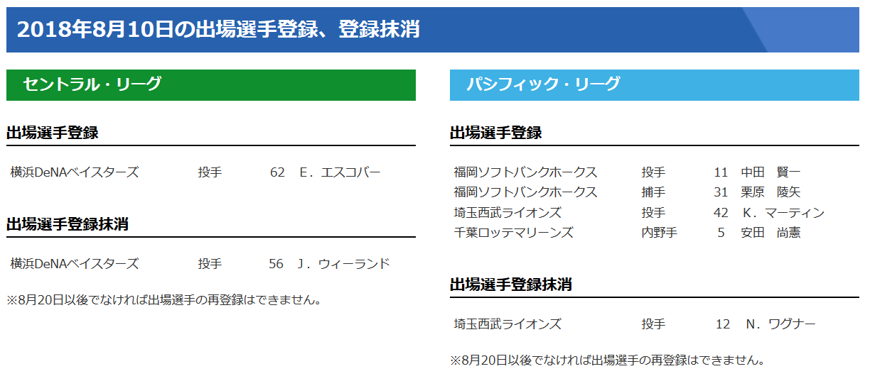 2018年8月10日の出場選手登録、登録抹消
