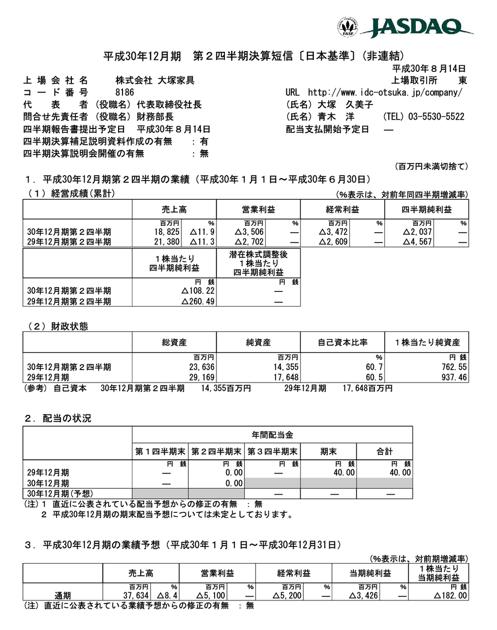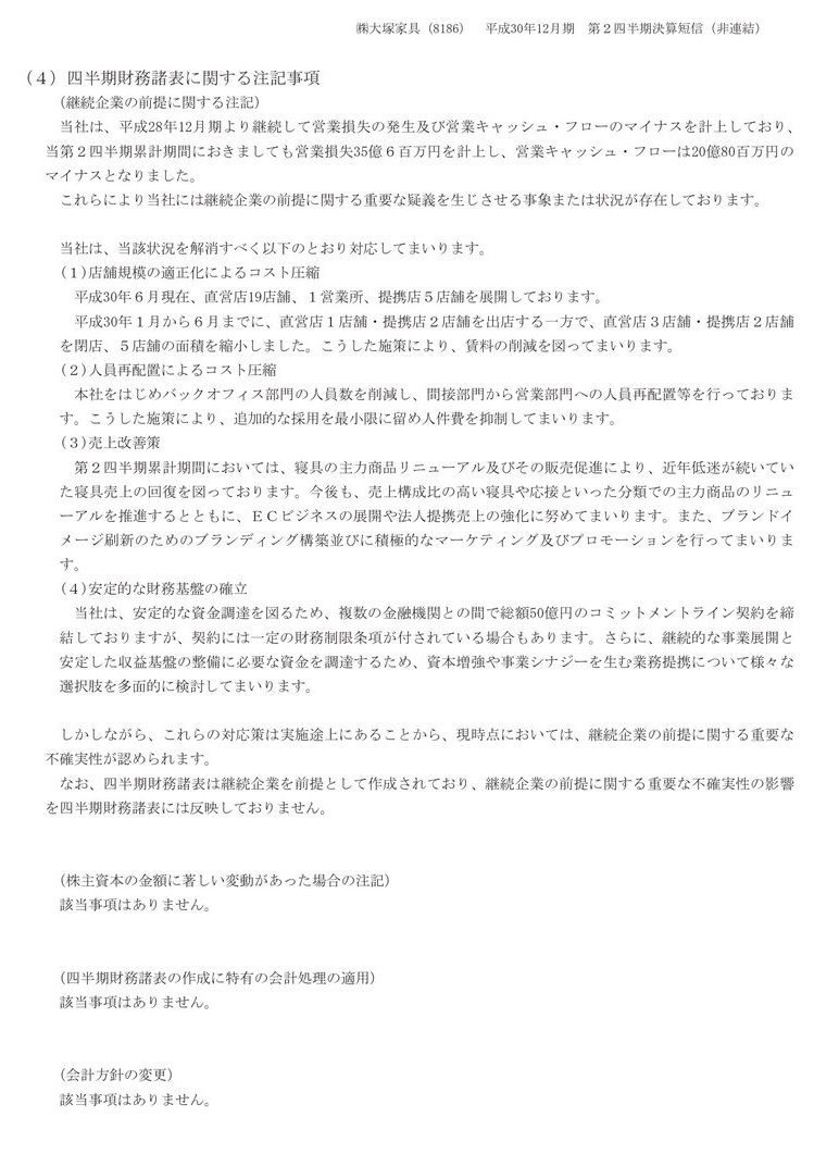 2018/08/14 15:15 大塚家具 平成30年12月期 第2四半期決算短信〔日本基準〕(非連結)