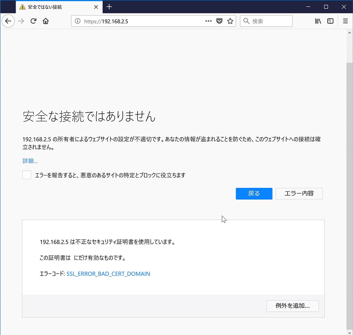 証明書がインストールされていないブラウザで、SSL化されたサイトに接続すると以下のような警告が出てきます。