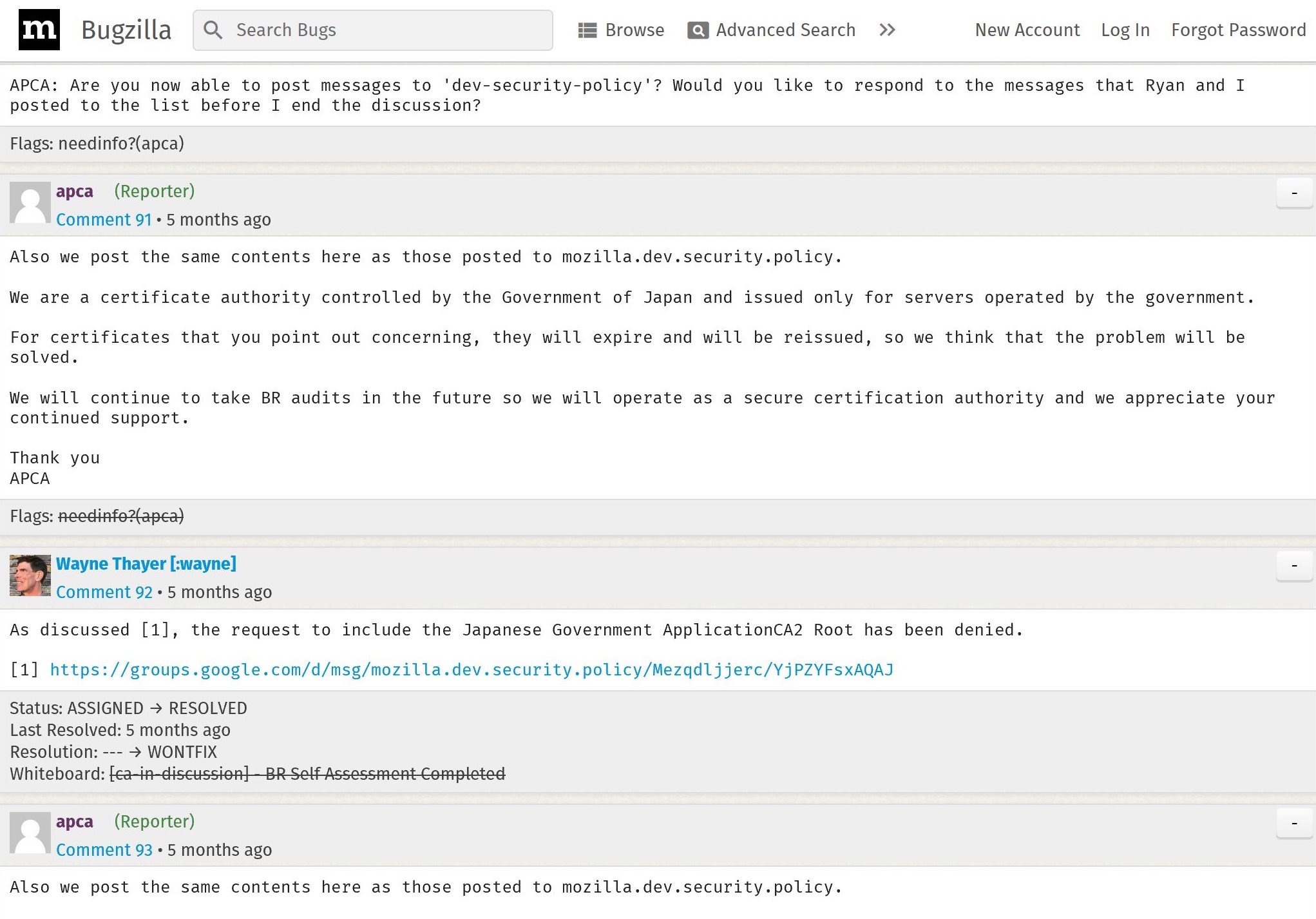 Mozillaのバグ管理システムであるBugzillaにmozillaとapcaとの奮闘記があります。