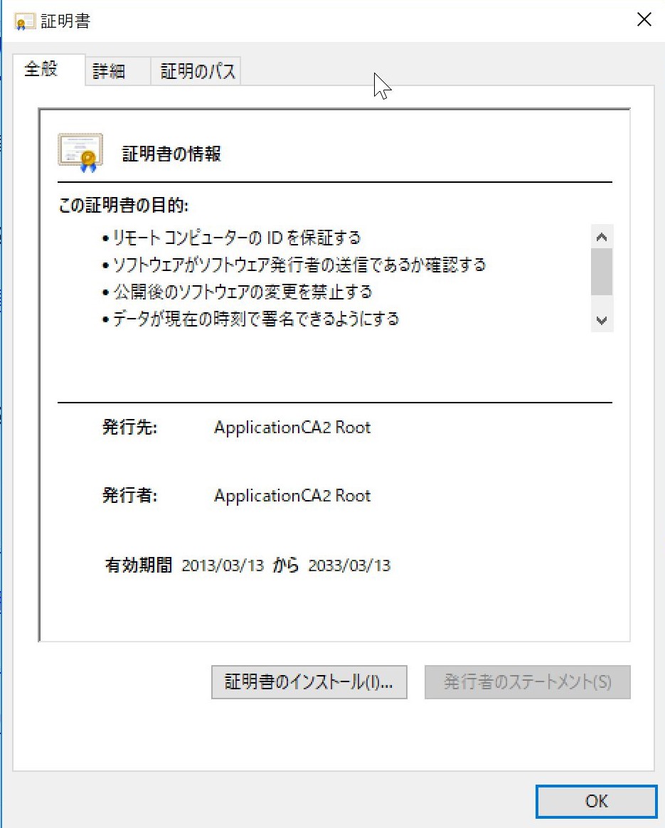 ApplicationCA2 Rootが発行者であることを確認できます。