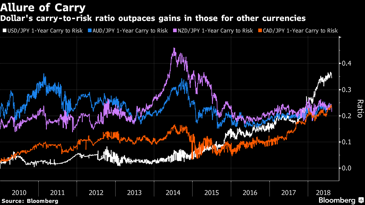 金利格差と予想変動率を比較したキャリー・トゥー・リスク比率はキャリートレードの魅力を測る指標だが、G10通貨で円に対してこれが最も高いのは米ドルだ。