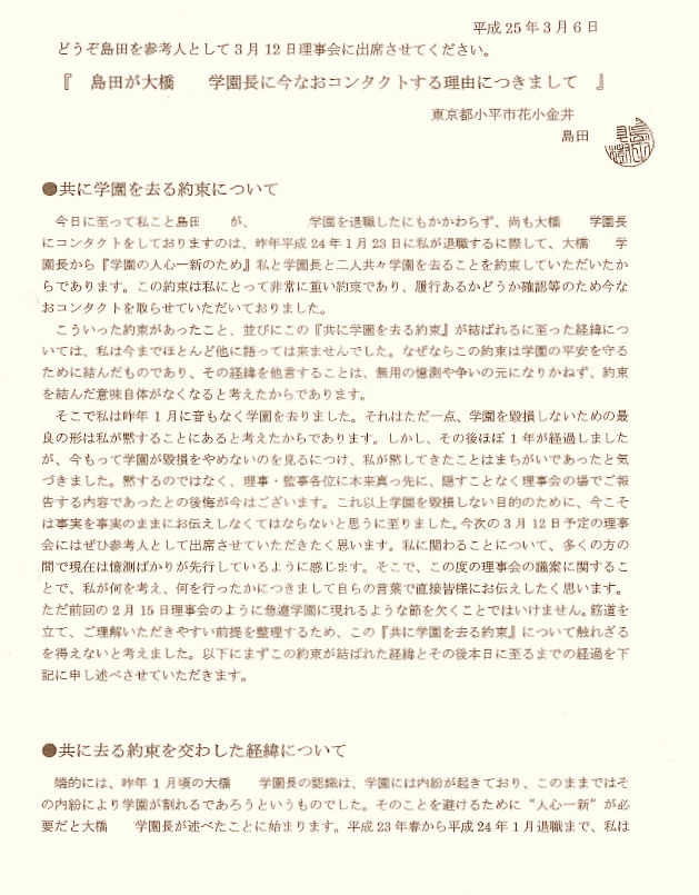 今日に至って私こと島田真樹(仮称)が、(港区私立共学校)を退職したにもかかわらず、尚も大橋清貫(仮称)学園長にコンククトをしておりますのは、昨年平成24年1月23日に私が退職するに際して、大橋漬貫(仮称)学園長から『学園の人心一新のため』私と学園長と二人共々学園を去ることを約束していただいたからであります。この約束は私にとって非常に重い約束であり、履行あるかどうか確認等のため今なおコンククトを取らせていただいておりました。