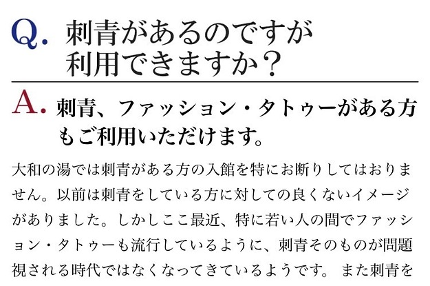 タトゥー禁止が目立つ日帰り温泉にあって、「全面OK」の方針をとる大和の湯のスタンスは異例と言える。