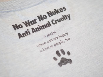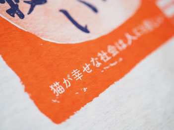 ショウジサダムさんのデザインによる肉球新党オリジナルTシャツです。デザインは3種、色は5種、サイズは4種あります。