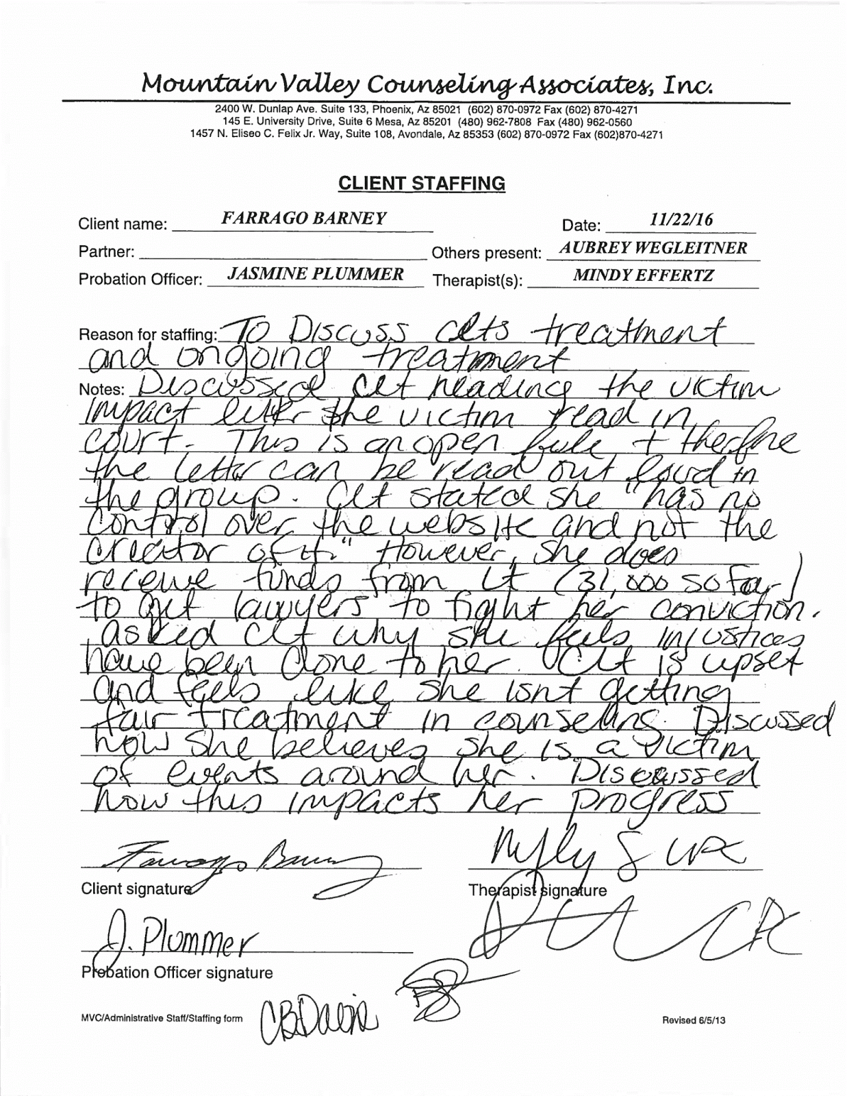 In November 2016 Farrah found the bravery to open up to her therapy group about the traumatizing rape she experienced during her most recent stay in jail. For this, Farrah was accosted by her therapist, Mindy Effertz. In a separate meeting with Farrah and her probation officer, Therapist Mindy Effertz of Mountain Valley Counseling claimed that Farrah was taking an ill-deserved victim stance. Effertz also forbade Farrah from further discussing the rape she experienced in jail, claiming that it was a rhetoric intended to distract from treatment. In the same meeting, demands were issued by Effertz to shut down a fundraiser operated solely by the former Justice4Sisk Team - a charity group who banded together to assist in paying Farrah's extortionate legal fees. With no option to argue, Farrah agreed to these demands.