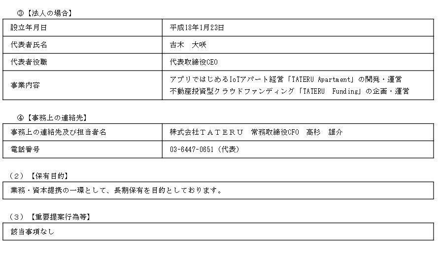 ・GA technologies株、長期保有→保有割合 0.00%(-7.88%)