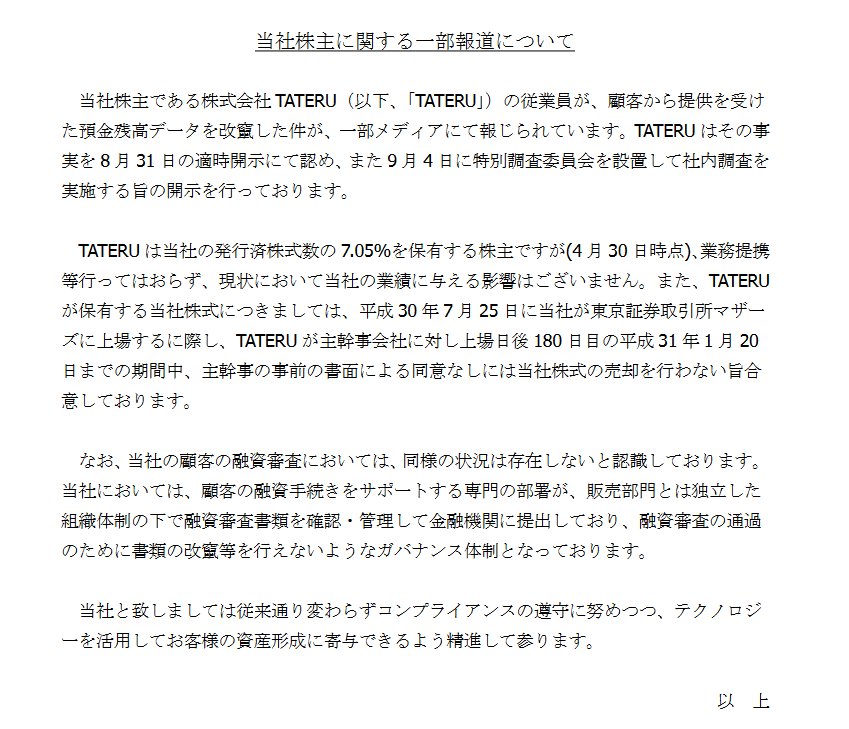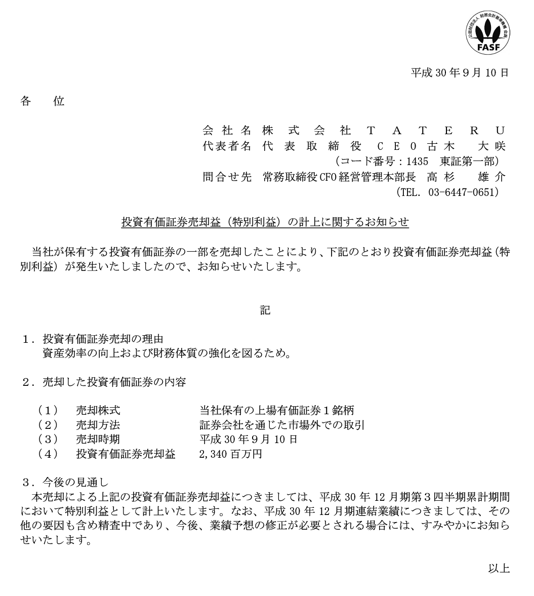 2018/09/10 16:45 TATERU 投資有価証券売却益(特別利益)の計上に関するお知らせ