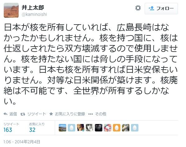 たとえば核武装論。田母神俊雄氏はこんなことを言っています。