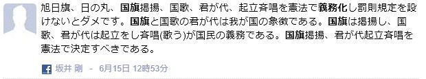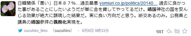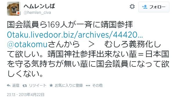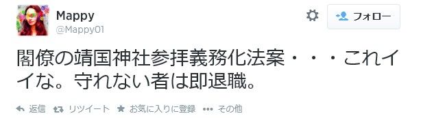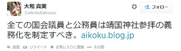また、意見の多様性を認めない発言が非常に多いです。例えば国会議員の靖国参拝の義務化を主張する人もいます。中にはもっと過激に、国旗掲揚や、マスコミの国歌演奏義務化まで言う人も。どこまで本気かわかりませんが。