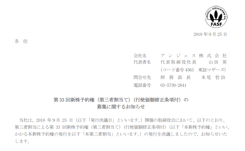 ※この前=やけにWikipediaが充実している創薬ベンチャーのアンジェス、根拠なき買い煽りのなかMSワラント80億円で株券印刷の歴史に新たな1ページ(2017/08/28)