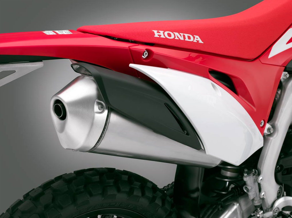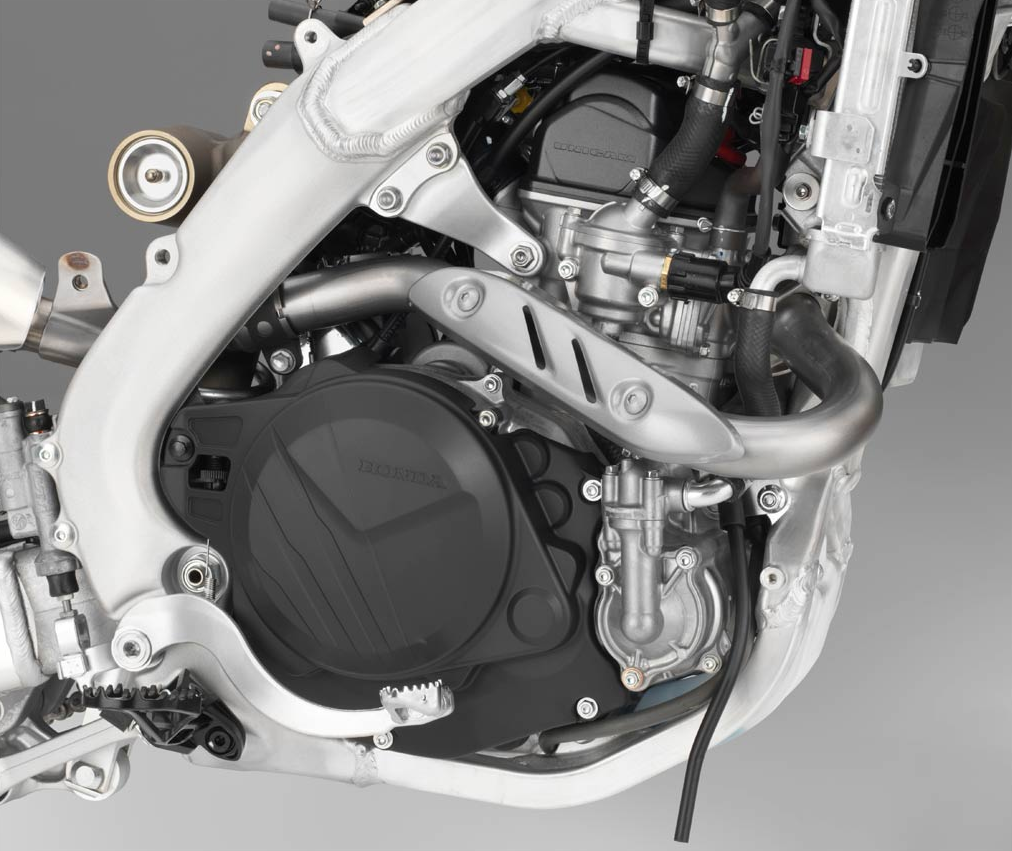 CRF450R、CRF450RXともに、燃焼室形状と排気レイアウトを見直し、排気効率を高めることでエンジンの全回転域において出力・トルクを向上させました。