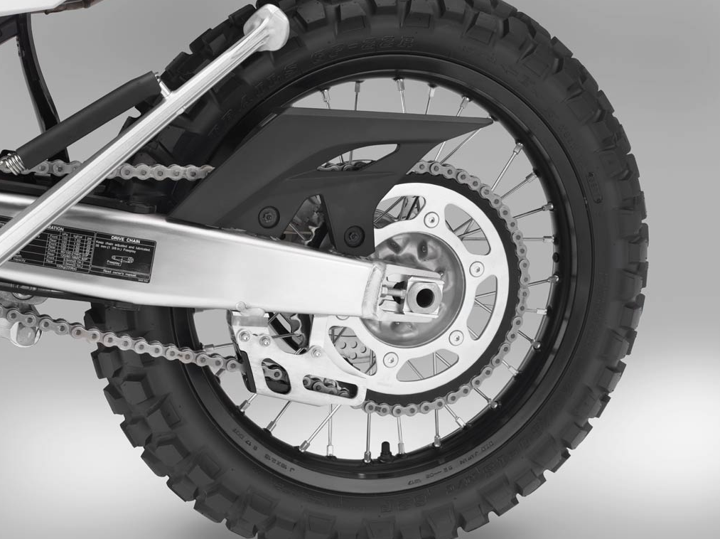 フロントは21インチのホイールを装備しており、CRF450Rは19インチのリヤホイールが装着されていますが、CRF450Lは18インチのリヤホイールが装備されています。