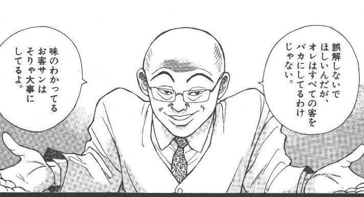 >開業当初は理想のラーメンを出しながらも客に理解されず、不渡りを出して店を潰し掛ける。"舌バカ"な客でも分るコッテリ味の"濃口"を編み出してからは繁盛店に。この時の不幸から心に大きな傷を負い、それ以降は一握りの味の分るお客に理想の味を提供するために、味の分らない客に情報を食わせて金を稼ぐというスタンスを貫いている。ただし、舌バカな客相手でも決して手を抜いたラーメンは作らない。