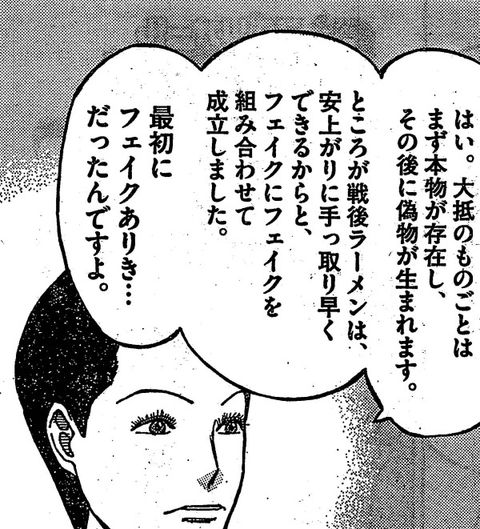 そして「ラーメン才遊記」のラスボス、カリスマ料理評論家(にしてヒロインの母)、汐見ようこは、ラーメンを「フェイク(偽物)」と定義し、完璧無比な技術で卓越したラーメンをつくりあげる。