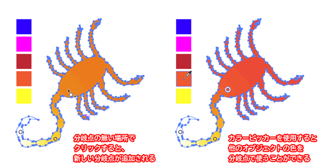 分岐点の周囲に出る円形の点線はスプレッドといい、これを広げたり縮めたりすれば、色の影響する範囲を調節することができます。