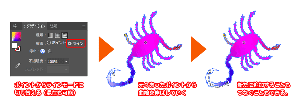 つぎはラインモードになります。ポイントモードはかなりザックリした使い方になりますので、複雑な形をしている場合は形に沿って色がうまく変化させられない、ということもあるでしょう。