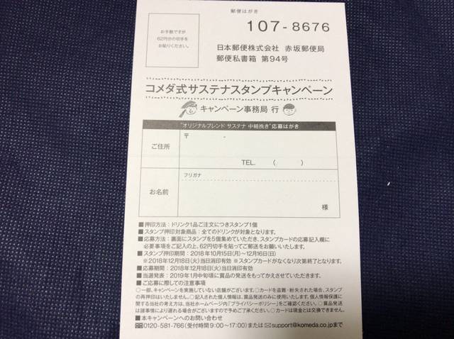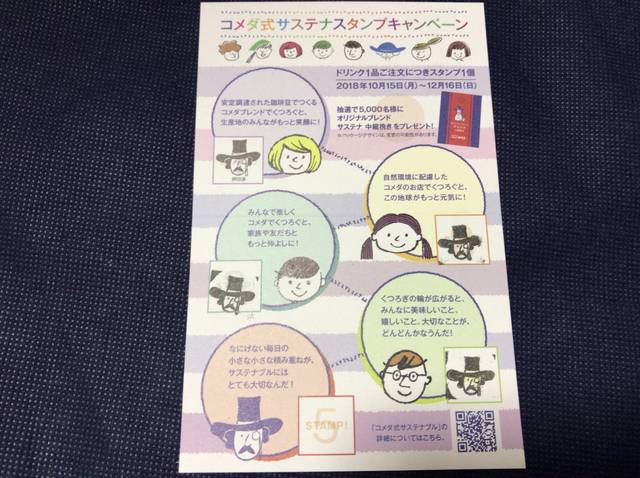 このキャンペーン期間は2018年10月15日(月)~12月16日(日)の2ヶ月間。ドリンク1品ご注文につきスタンプ1個がもらえ、スタンプ5個を集めて応募すると、抽選で5,000名様にオリジナルブレンドサステナ中細挽き(珈琲粉200g)がプレゼントされる。キャンペーンの応募はがきの裏がスタンプカードになっており、スタンプカードはコメダ珈琲店でドリンクを頼み会計をするときにもらうことができる。