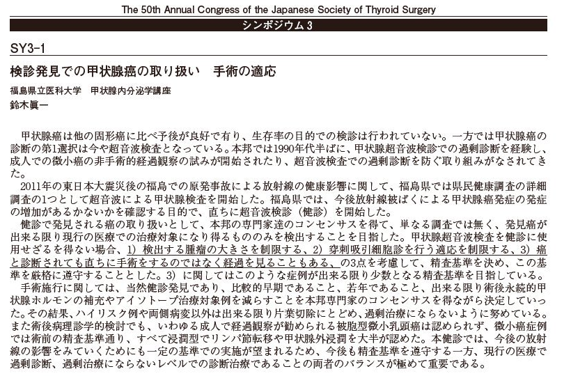 注:学校検査について、「学校検診」と言う言葉が出てくるが、2014年3月2日の第2回甲状腺検査評価部会で、福島県立医科大学の甲状腺外科医である鈴木眞一氏は、はっきりと、福島県の甲状腺検査は、死亡率を下げることが目的の「(がん)検診」ではなく「健診」であると述べている(議事録の31ページ目を参照)。2017年10月末の第50回日本甲状腺外科学会学術集会でのシンポジウム発表抄録(以下のスクリーンショットを参照)では、最初に「検診」と言及してはいるが、「今後放射線被ばくによる甲状腺癌発症の増加があるかないかを確認する目的で、直ちに超音波検診(健診)を開始した。」と説明した後は、「健診」としているため、「学校健診」と認識すべきであろう。しかし、この書き起こしでは、発言者が「検診」を用いていることが分かっていたり、発言の文脈から通常のがん検診と同様に考えていると思われるため、あえて「検診」としている。