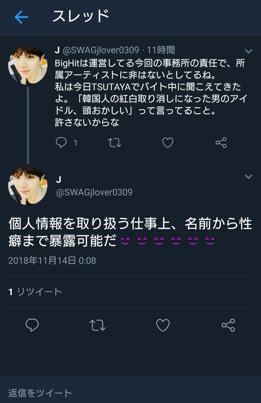 Twitterに「BigHitは運営してる今回の事務所の責任で、所属アーティストに非はないとしてるね。私は今日TSUTAYAでバイト中に聞こえて来たよ。「韓国人の紅白取り消しになった男のアイドル、頭おかしい」って言ってること。ゆるさないからな」と投稿。