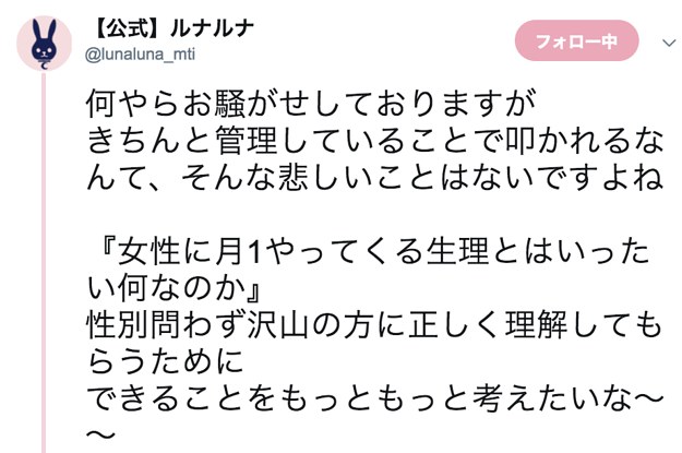 女性から反発の声が上がるなか、ルナルナのTwitter公式アカウントは「なにやらお騒がせしておりますが…」と投稿し、こう続けた。