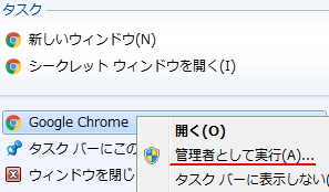 1. Chrome アイコンを右クリックする2. ポップアップメニューから「管理者として実行(A)...」を選択する