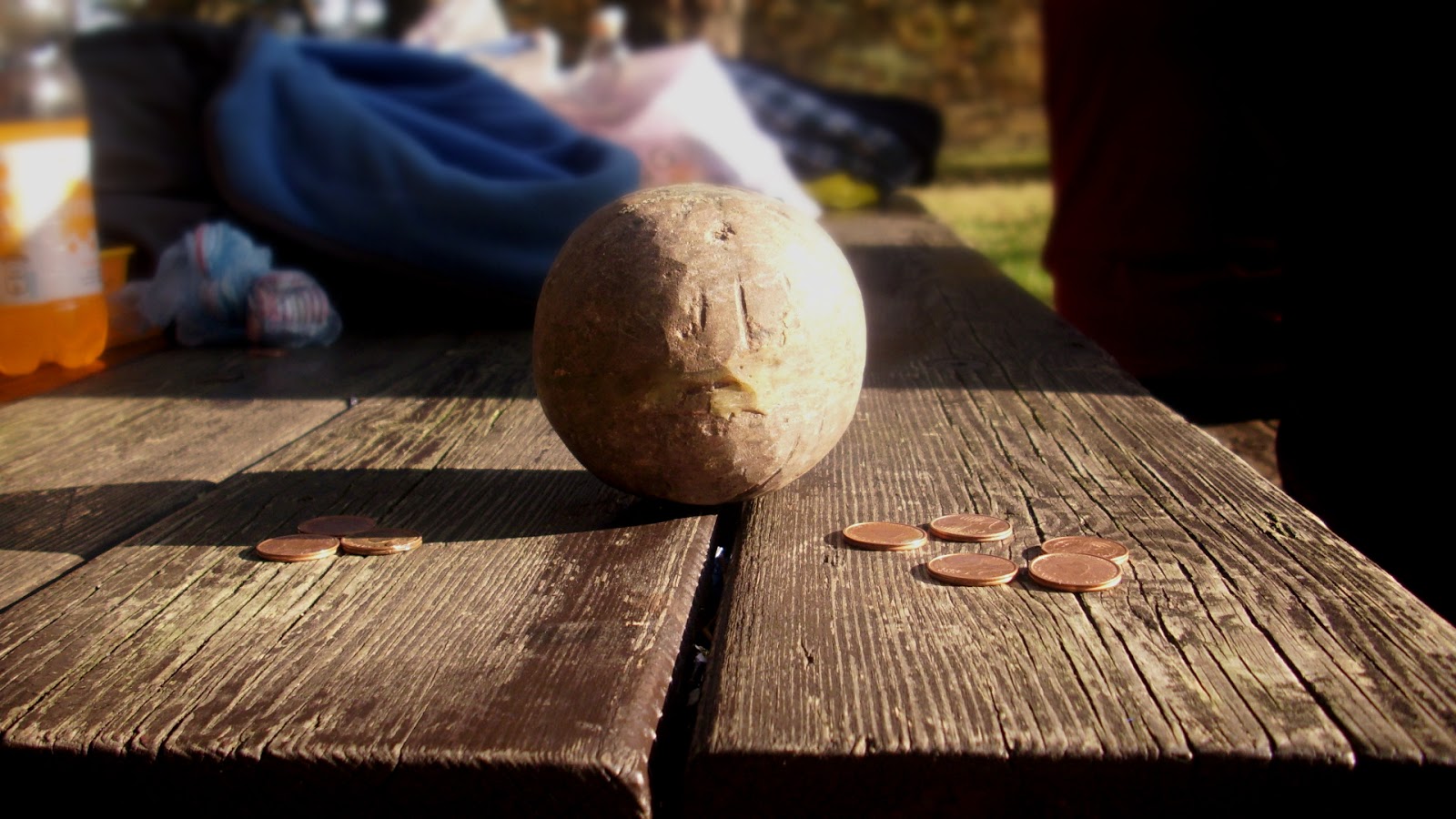 De foto hier beneden laat zien hoe er wordt ingezet. Aan de rechterkant kun je zien dat er met zes spelers wordt gespeeld. (De winnaar hoeft namelijk niet in te zetten). Aan de linkerkant is alvast de inzet voor het volgende spel, die door de twee heren op het bankje en mijzelf zijn ingezet.