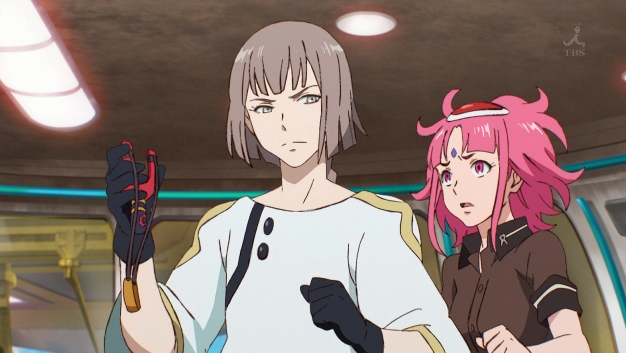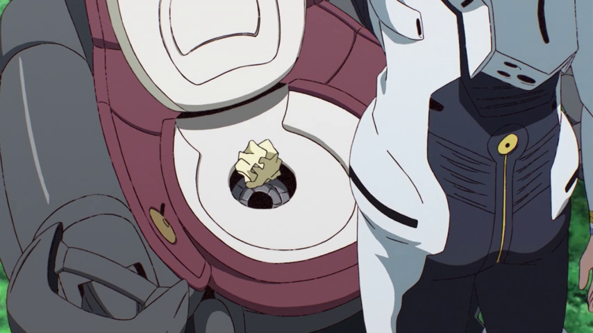続く第3話中盤。クリム=ニックがコックピット内で何かを捨てる。