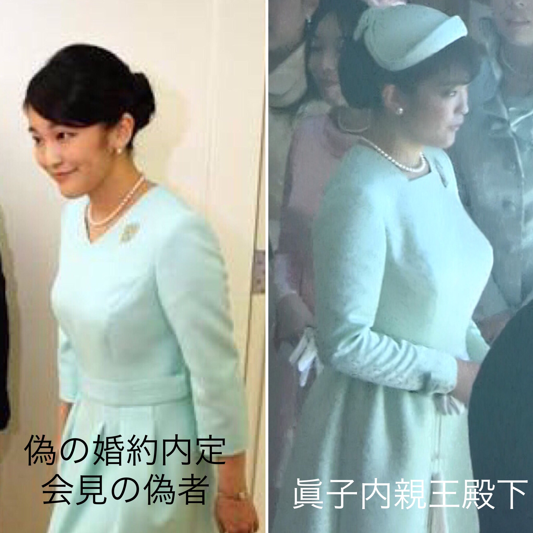 2017年の婚約内定発表以降、全て偽者だと知るため。見分けがつき難いという人もいたので、本当の眞子様画像と並べています。眞子さまでは無い別人が眞子さまと名乗り、婚約内定会見までしました。立派な犯罪です。マスコミも宮内庁も一部の皇族もグルです。前代未聞の事件が未だ解決されず、週刊誌でも嘘記事ばかりが平気で流れているのは許されないことです。画像は、眞子様の画像自体、長年改悪されてきました。主に目を変えられています。あとは鼻が低くなっていたり、顎を大きくしていたりしています。ただ、その人が元々持っている雰囲気、存在感は変わりません。それを理解するために、枚数を多く観ることで違いが分かるようになって行くと思っています。