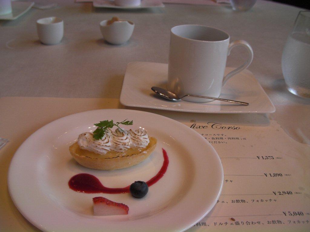 デザートはタルトシトロン。タルトシトロンとはフランス菓子でレモンのタルトに甘酸っぱくて濃厚なレモンクリームが入っていて、その上にバーナーであぶったメレンゲがのっているお菓子。タルト生地がサクサクしておいしい。飲み物はそれぞれコーヒーと紅茶を注文。
