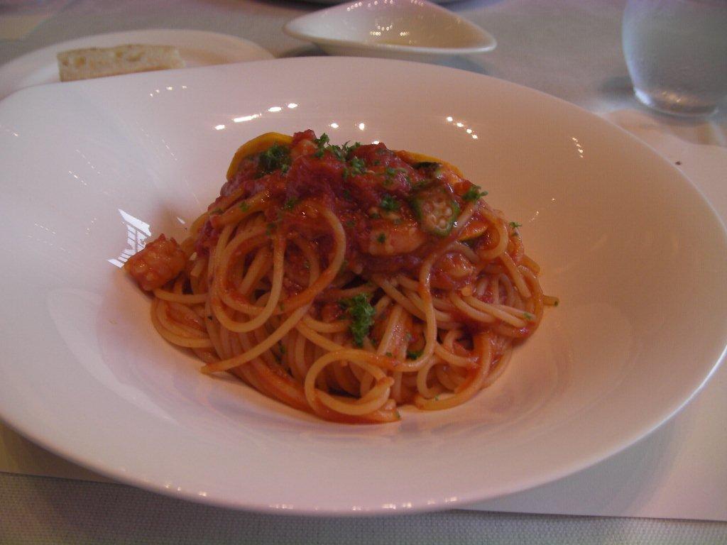 私は小海老とオクラ・ズッキーニのトマトソースパスタ