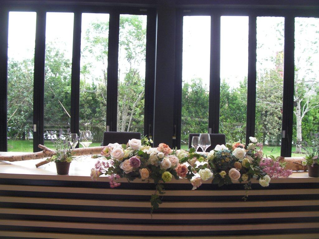 店内から芝生を見る。