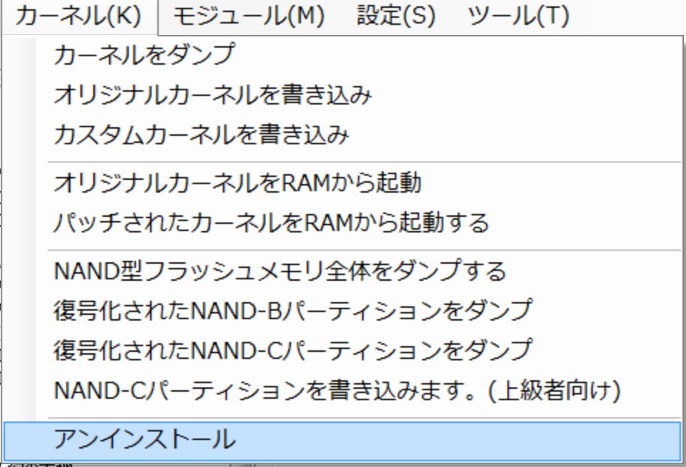 もし以前にhakchi2や、古いUSB MODを導入したことのある方はhakchi.exeを起動し、下の画像を参考にカーネル→アンインストールを選び本体を初期化してください